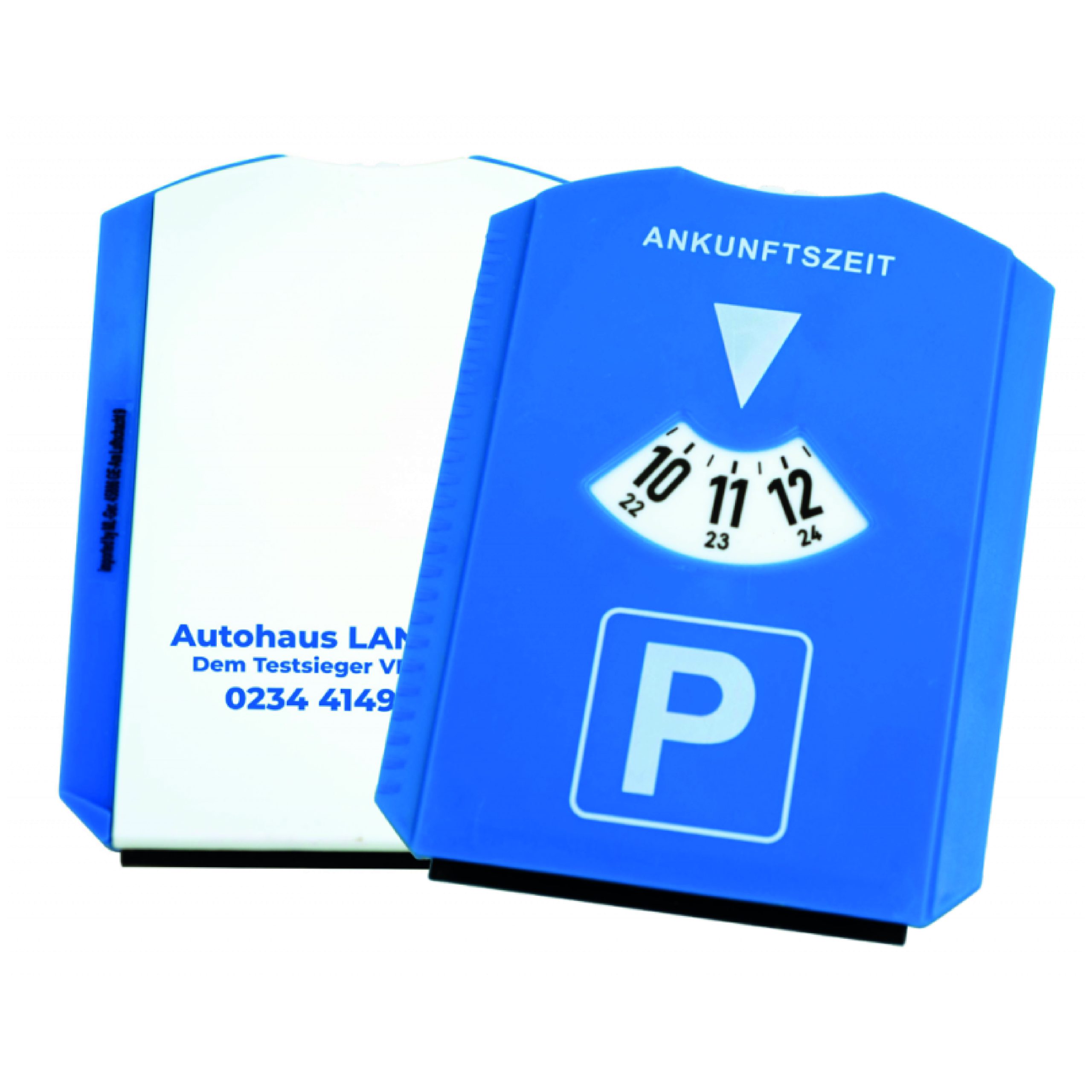 Bedruckte Parkscheibe mit Eiskratzer und Wasserabstreifer.